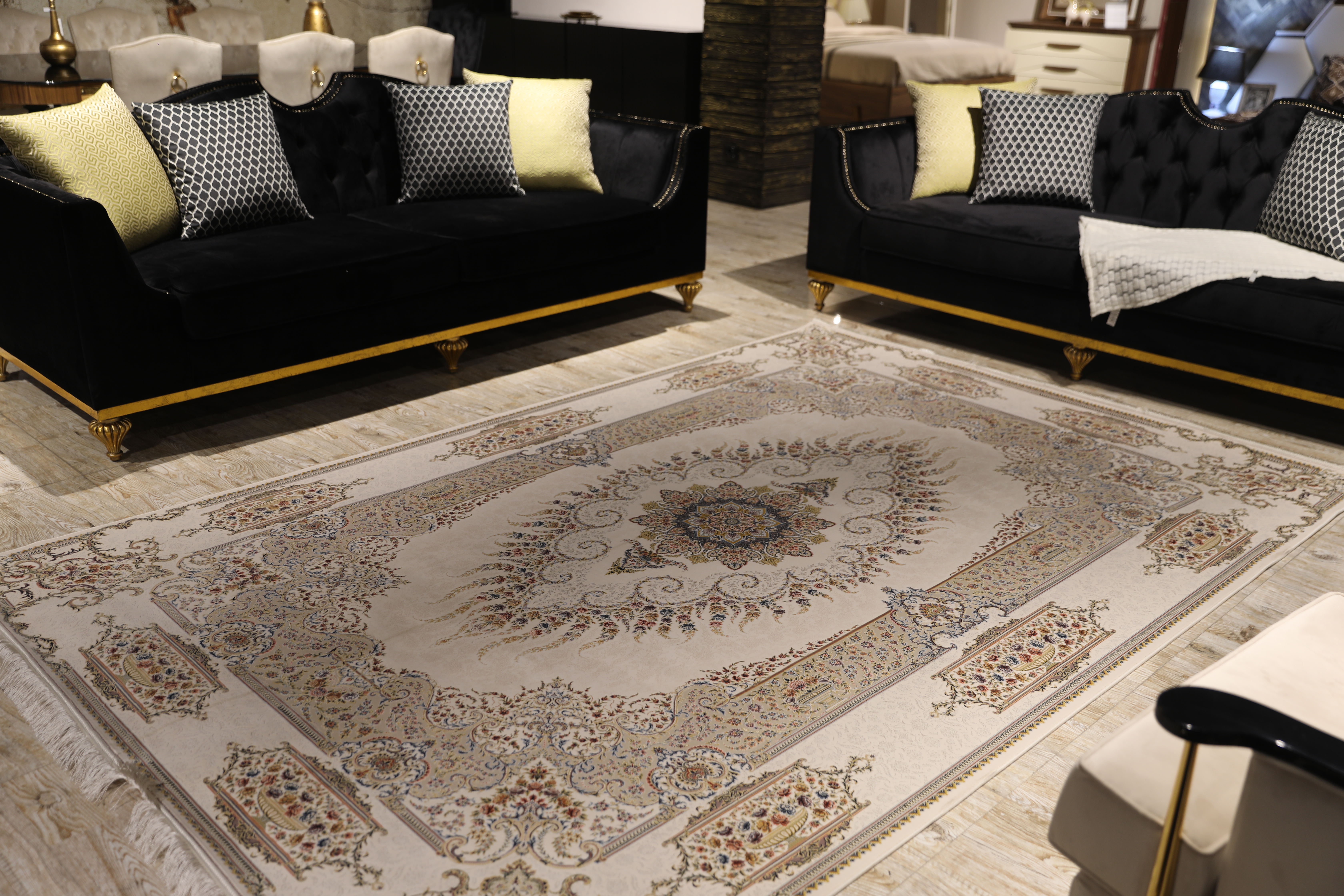 در مقاله آیا سایز فرش مناسب خانه خود را می دانید؟ به این مورد خواهیم پرداخت که به طور کلی ۱/۳ مبل یا صندلی شما باید در زیر فرش قرار بگیرد. و این را هم اضافه کنیم که شما می توانید تمامی وسایل تزئینی در زمینه چیدمان منزل خود را نظیر کاناپه، مبلمان و میز را بر روی فرش قرار دهید.